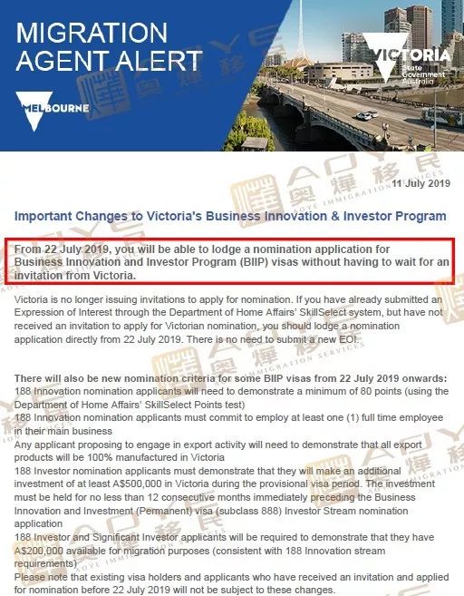 從2019年7月22日起,維州州政府不再發出擔保邀請。因此如果申請人已通過EOI系統遞交意向書而又尚未收到維州擔保的邀請,即可于2019年7月22日起直接遞交商業創新和投資者項目(BIIP)簽證的維州擔保申請。注意:無需提交新的EOI。