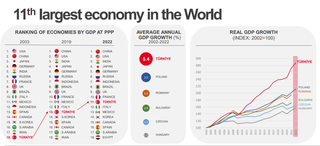 土耳其作為全球11大經濟體,自2002年以來,土耳其加大基礎設施建設投入,不斷改善投資環境以吸引外資,大力發展對外貿易,經濟建設取得較大成就,形成了以現代化服務業為主、工業、農業為輔的新一代產業結構。