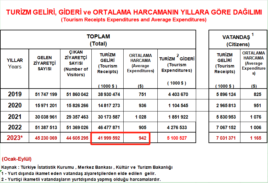 2023年1-9月土耳其旅游業創收近420億美元,土耳其旅游業人均花銷達942美元。