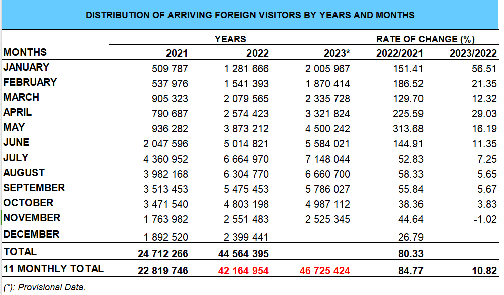 2023年1-11月外國游客達4672萬,相比2022同期增長10.82%。
