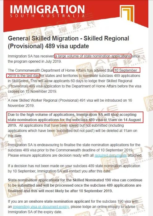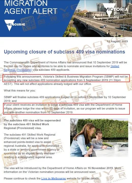 另外,維多利亞州政府也發表聲明表示:2019年9月5日晚11:59pm之后將不再接受任何新的489簽證提名申請,并將在2019年9月10日之前,完成9月5日或之前提交的489申請。而收到邀請的申請人須在60天內提交簽證申請。