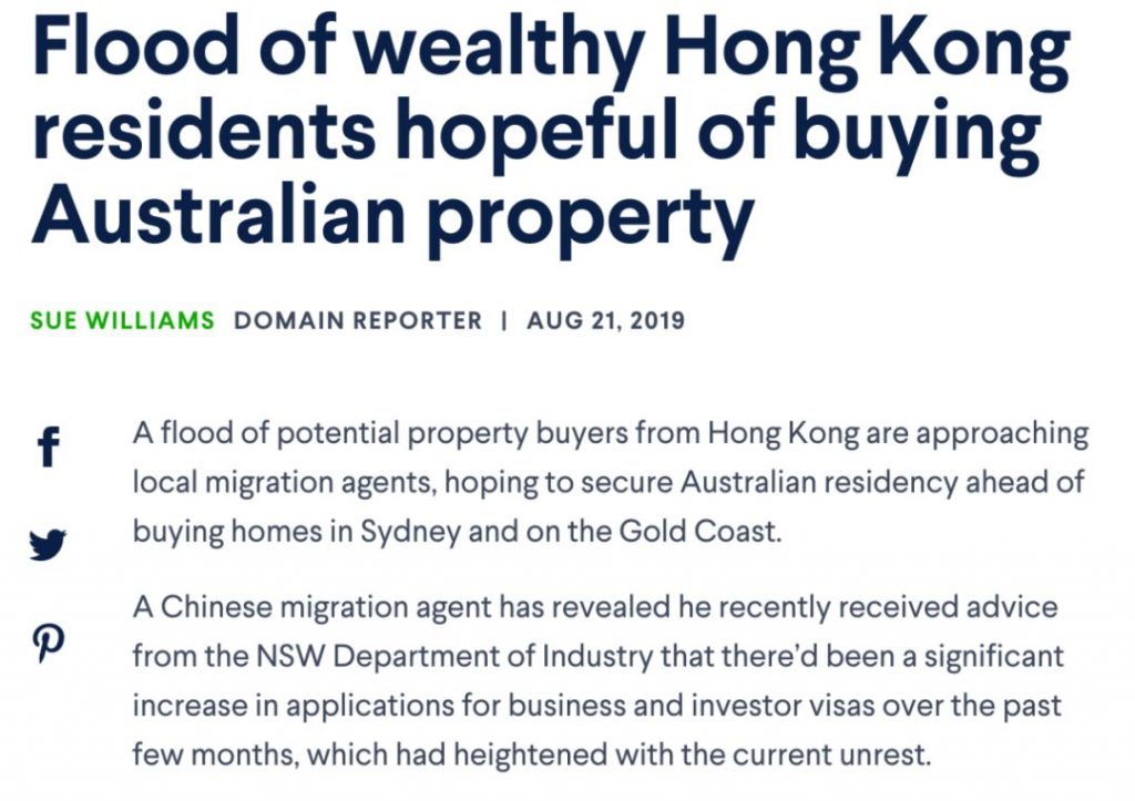 而房地產網站Domain也報道大量來自香港的潛在購房者正在進行澳洲房產咨詢,