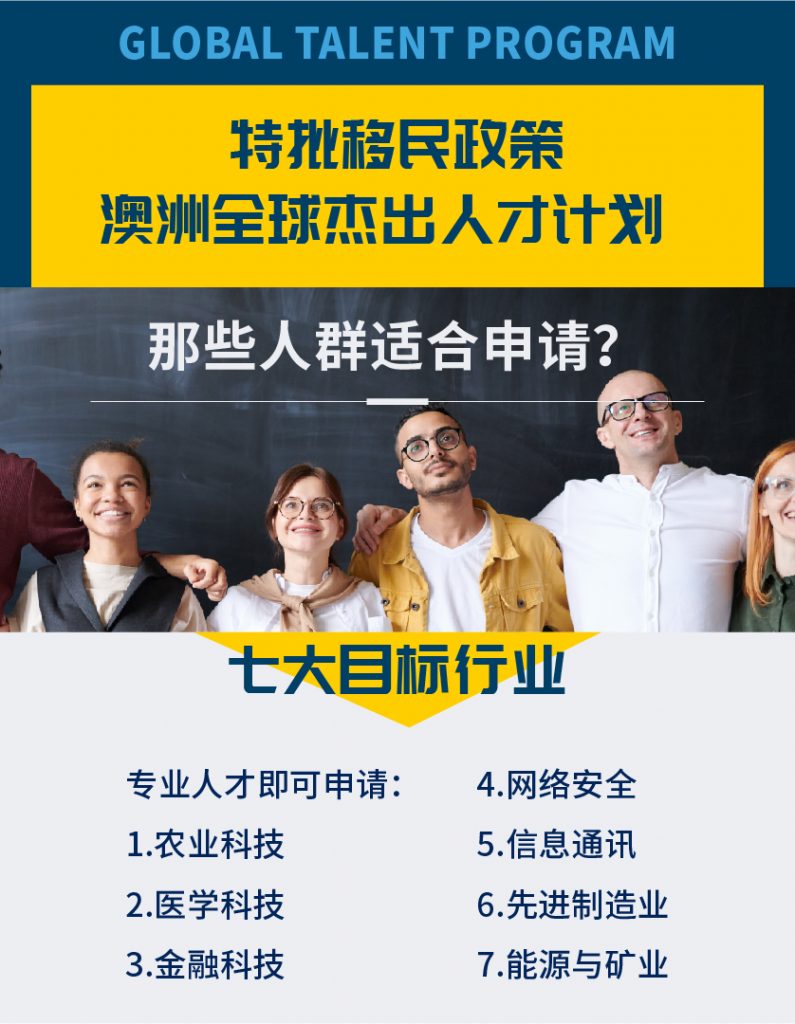 澳大利亞GTI(Global Talent Independent program)全球人才移民計劃項目于2019年11月4日正式啟動,該計劃旨在建立一個高技能的移民渠道,目標群體是各行業專家及工程師【計算機、網絡、通信、數據、醫學、生物工程、農業技術、能源采礦、金融技術等】、學者、研究人員、專利持有人、跨國公司高管、演員、運動員或其他國家級或國際獎項獲得者等等。