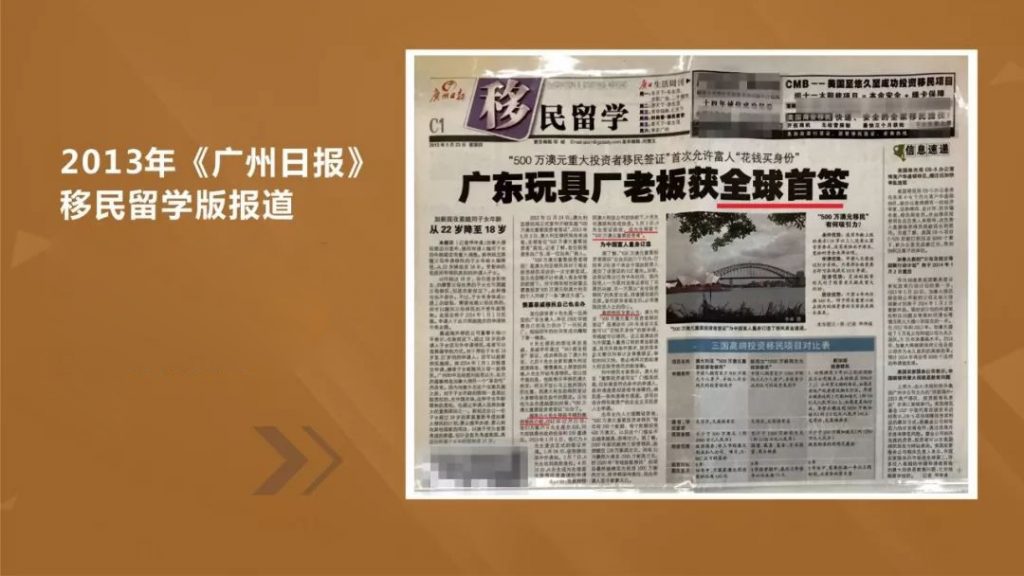 2012年11月24日,澳大利亞移民局正式宣布開始實施“500萬澳元重要投資者簽證”,2013年5月3日,澳大利亞移民局傳來消息,就有“500萬澳元重要投資者”獲批,記者了解,獲簽者來自廣東,是一位玩具廠商人。