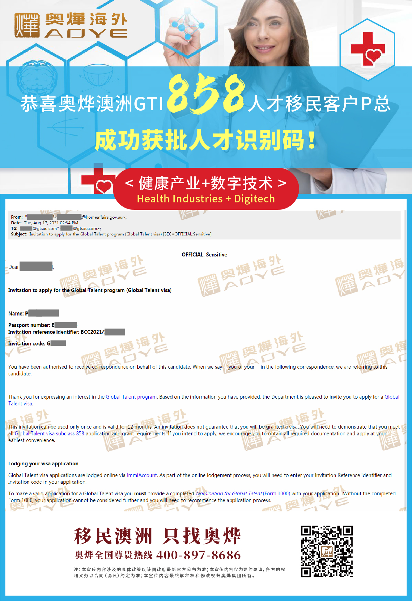 奧燁喜訊持續來襲 恭喜我的客戶P總喜提858人才識別碼 從遞交申請到獲邀僅1個月時間! 別觀望了!現在就聯系我為您評估方案吧!
