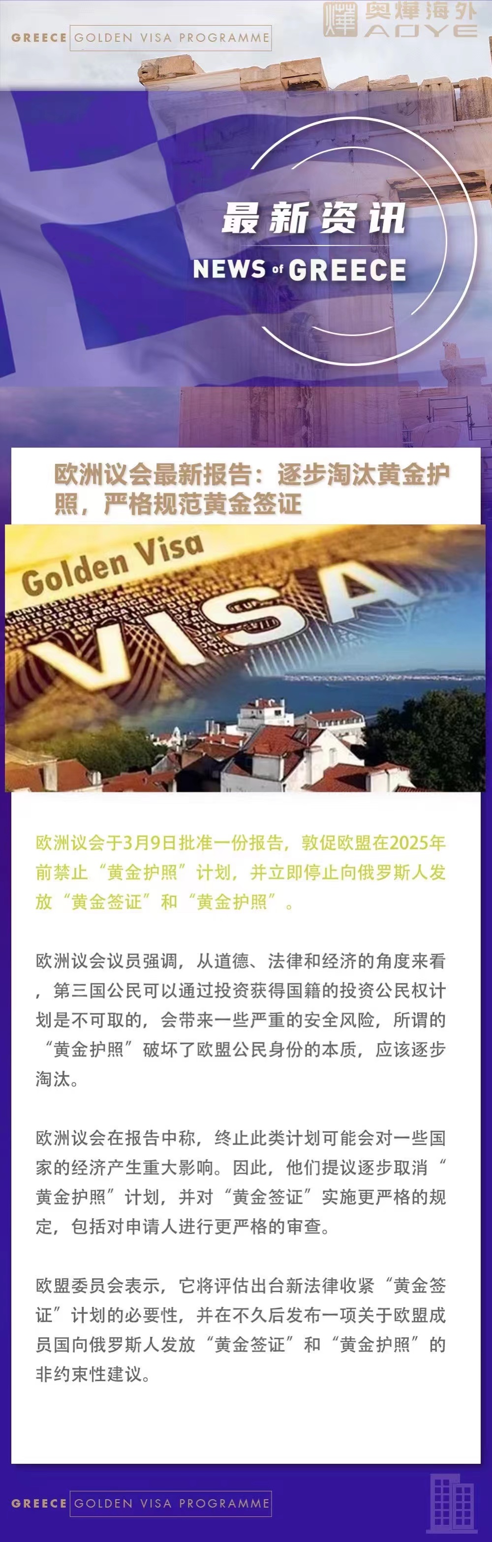 歐洲議會于3月9日批準一份報告,敦促歐盟在2025年前禁止“黃金護照”計劃,并嚴格規范黃金簽證。