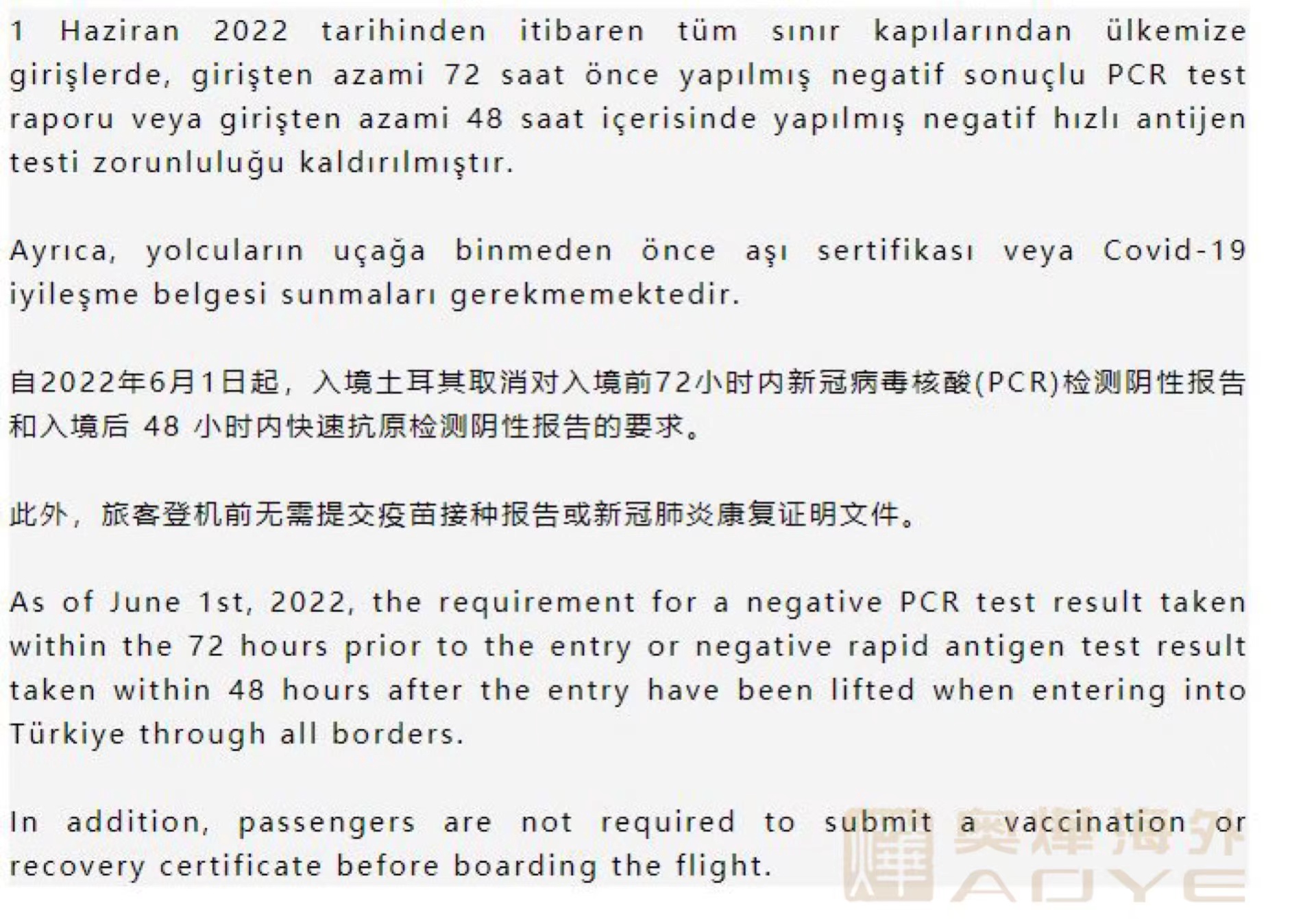 🇹🇷自2022年6月1日起,入境土耳其取消對入境前72小時內新冠病毒核酸(PCR)檢測陰性報告和入境后 48 小時內快速抗原檢測陰性報告的要求。 旅客登機前無需提交疫苗接種報告或新冠肺炎康復證明文件。