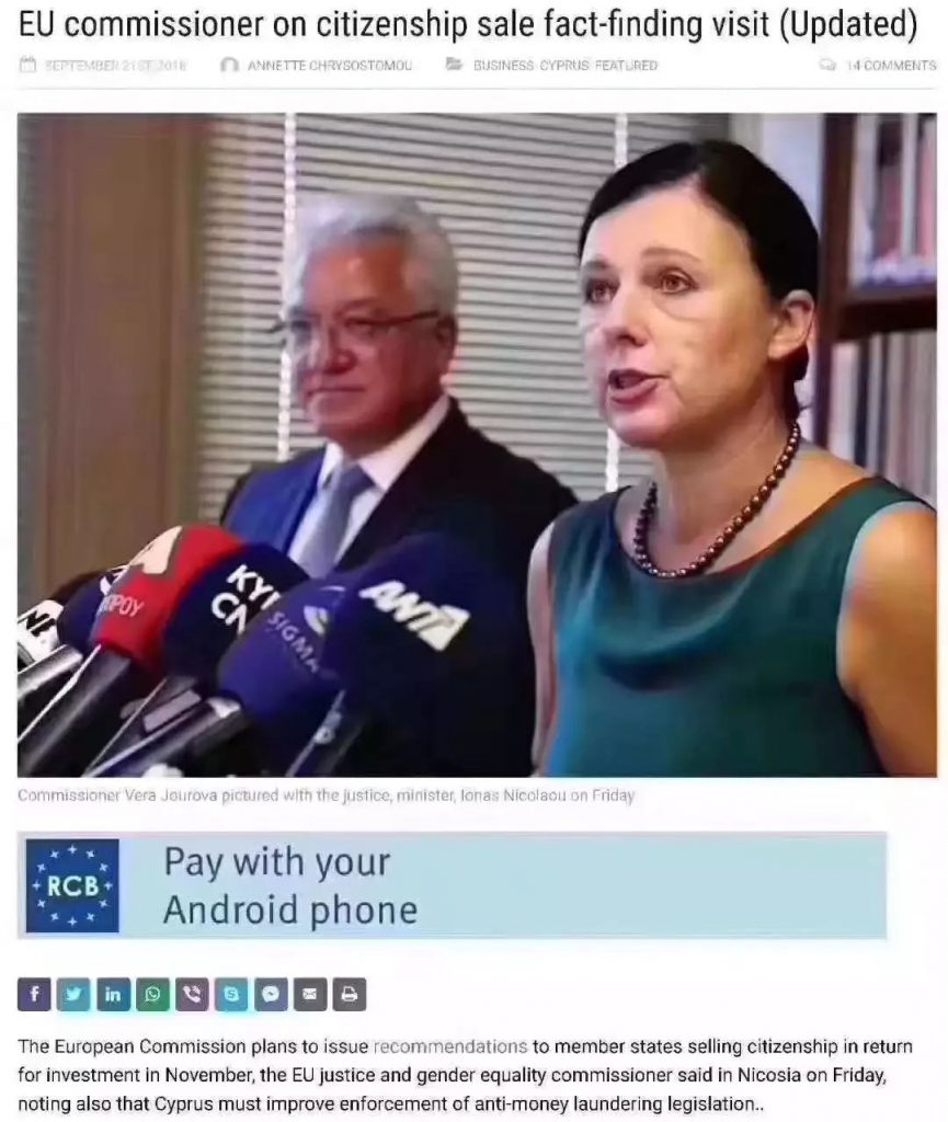 歐盟專員就投資入籍事宜訪問了塞浦路斯,并敦促加強反洗錢立法。11月,歐盟投資入籍報告將發布,各成員國入籍條件需”合規”。