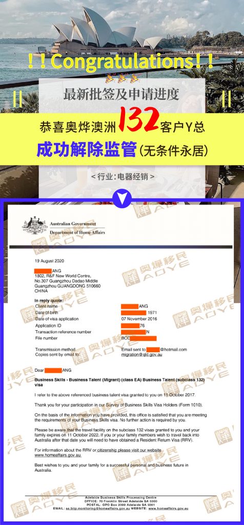 恭喜奧燁澳洲132客戶Y總 成功解除監管(無條件永居),行業:電器銷售