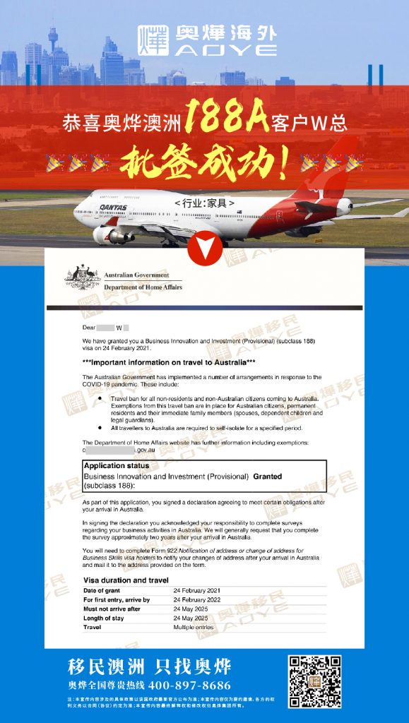 恭喜奧燁澳洲188A客戶 W總~批簽成功~