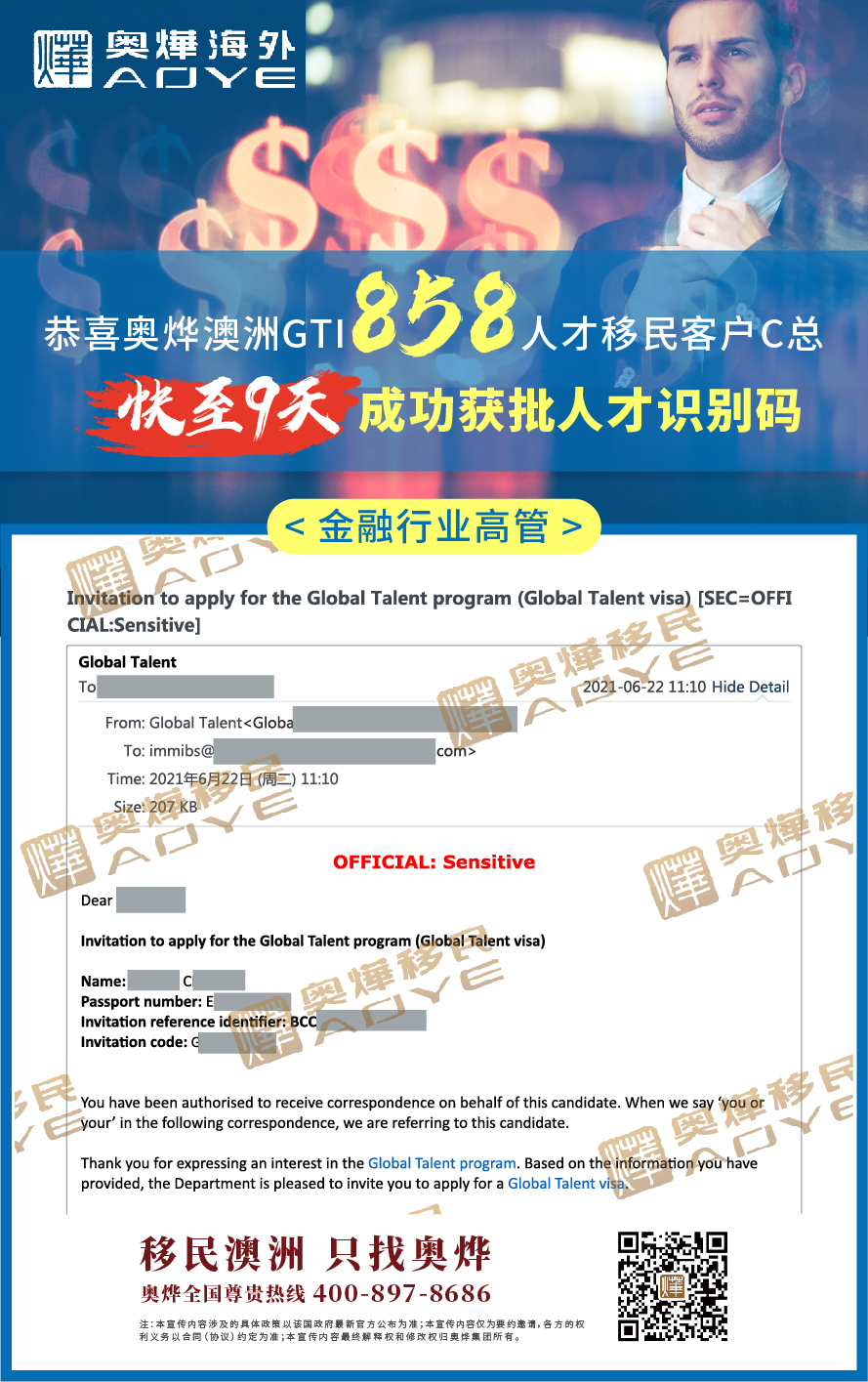 恭喜奧燁澳洲858客戶C總 快至9天獲批人才識別碼(金融行業高管)