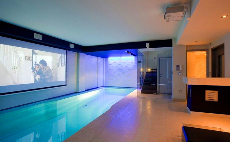 同層浴室配有桑拿房,室內泳池設計巧妙,充分利用了沙發和背投屏幕的空間,貫穿于整個房間的兩端,底層配有全套完善健康的SPA設施。