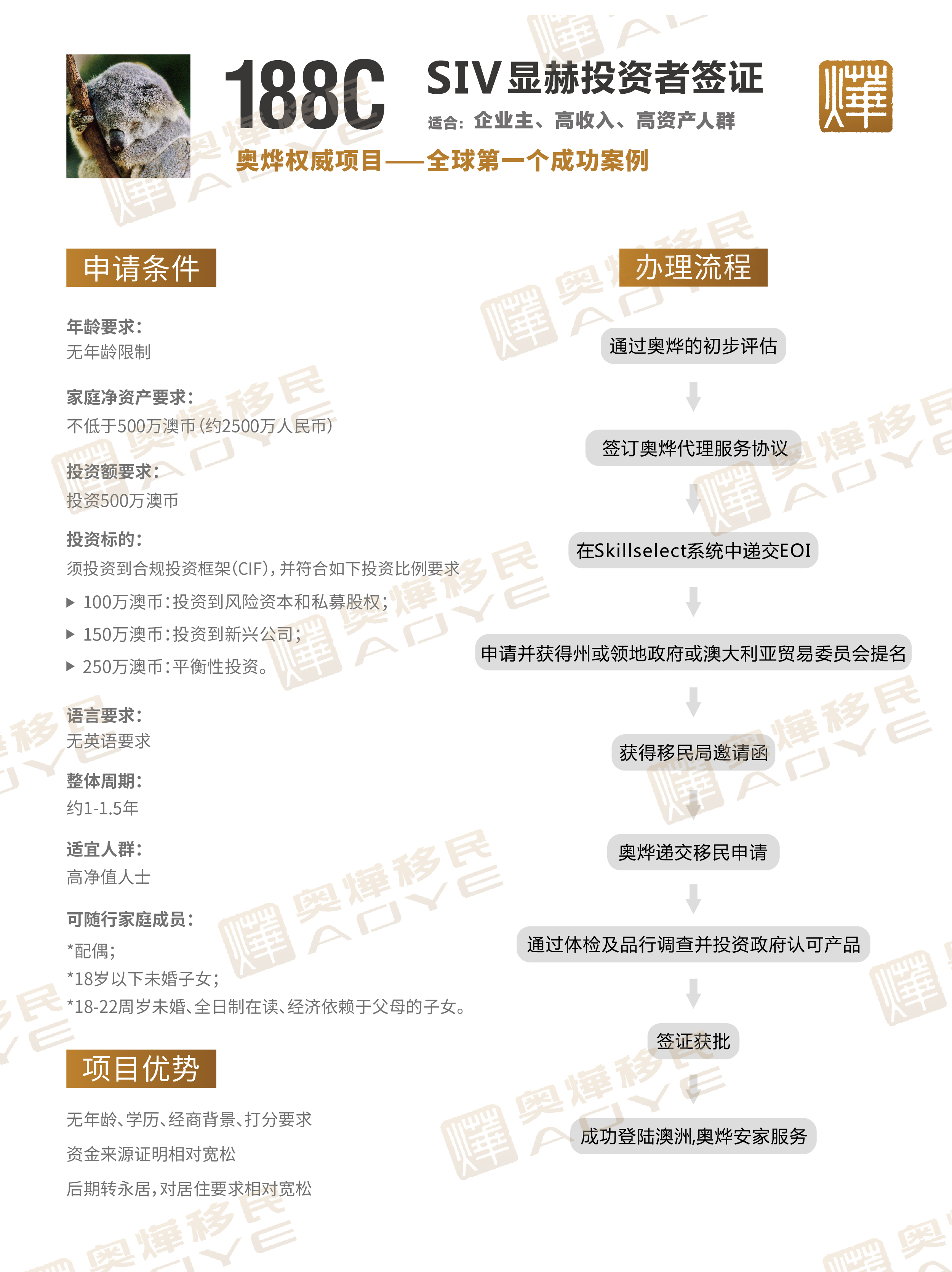 188C簽證,也稱作“澳洲重大投資者移民”,是2012年11月24日推出的全新投資移民類別,適合高資產高收入人士。188C簽證無年齡上限要求,無從商背景要求,只需投資 500萬澳幣到澳洲政府認可的債券、基金、項目及公司,即可獲得4年長期居留簽證。4年內只需居住滿160天,即可輕松辦理888C簽證轉永居。由于既不要求赴澳經商,也不要求長期居住,最適合事業重心仍在中國的精英富豪們,因此成為最受中國人青睞的項目。
